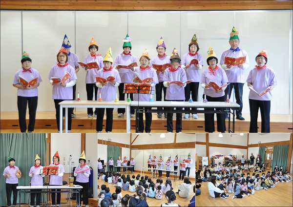 12月12日(木)神田幼稚園・東員保育園、12月16日(月)笹尾西幼稚園・笹尾第一保育園、12月17日(火)稲部幼稚園・いなべ保育園を訪問し、センターの「コーラスの集い」会員が楽器演奏、紙芝居や手遊びを加えた