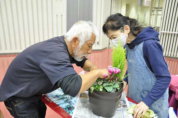 11月29日(土)東員町保健福祉センターで「冬の草花の寄せ植え教室」を開催しました。花まつり 今井先生の丁寧な指導を受け、植え付けの方法や水やりの仕方、肥料の与え方など教えていただき、